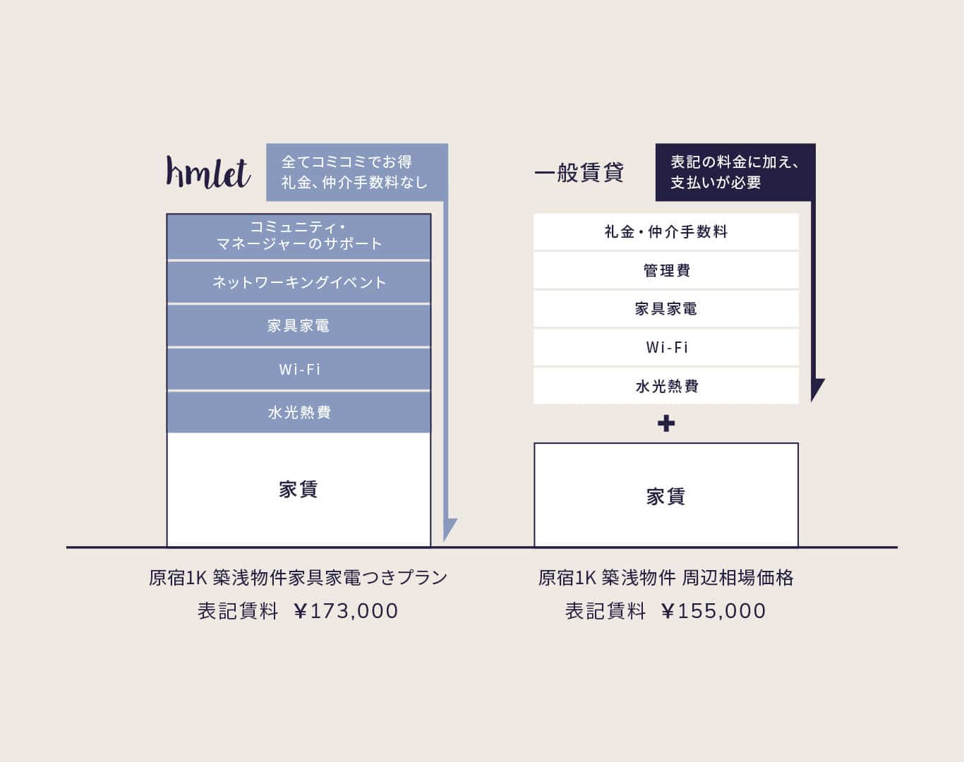 引越しには2つのハードルがあります。まず1つは、初期費用。ハムレットでは、礼金・仲介手数料はかかりません。さらに、家具はお部屋に予め設置されてるため、新たに購入する必要がありません。そのため、初期費用を大幅に抑えることができます。