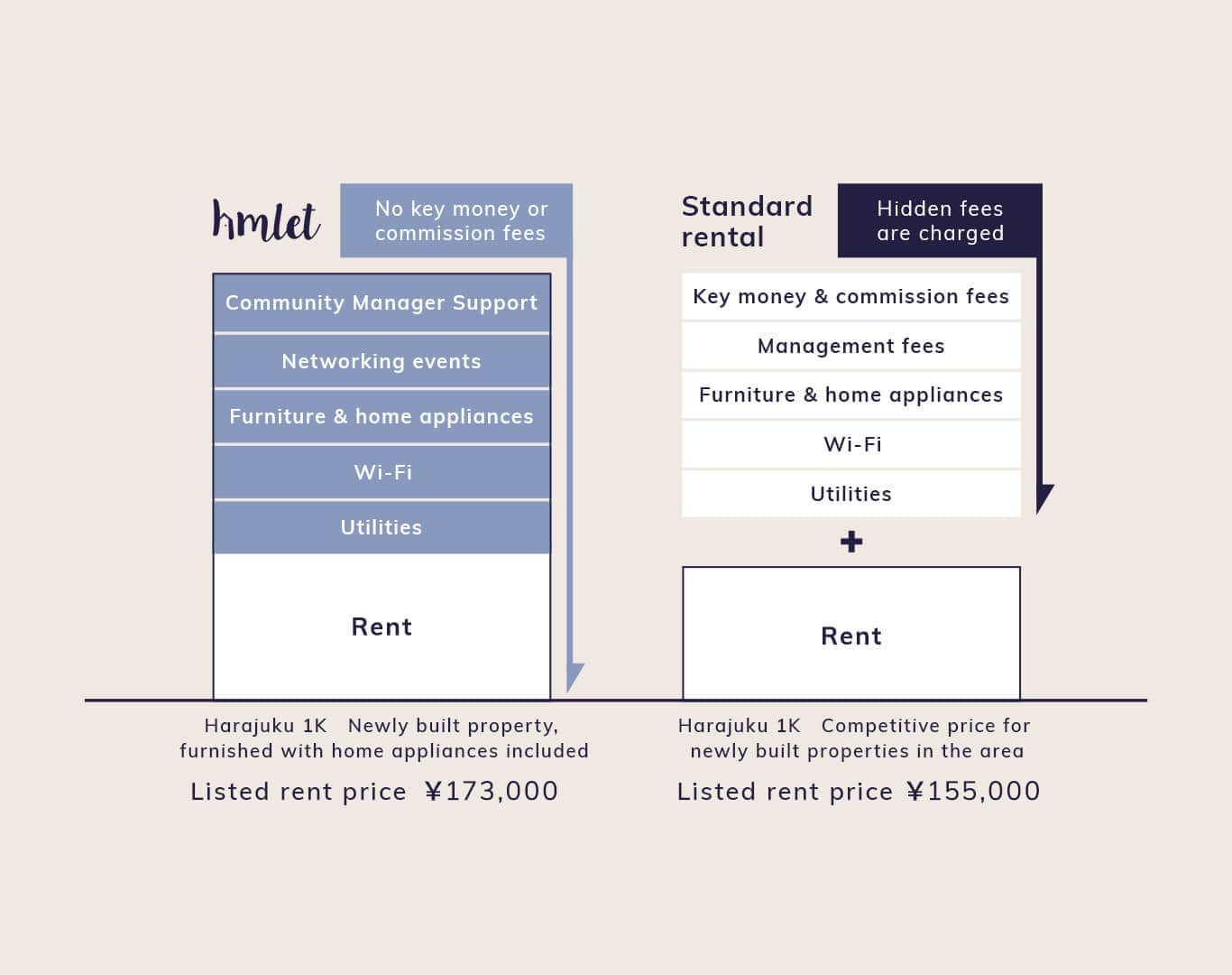 There are two hurdles to moving. The first is the initial cost. With Hmlet apartments, there is no key money, or any hidden brokerage fees!