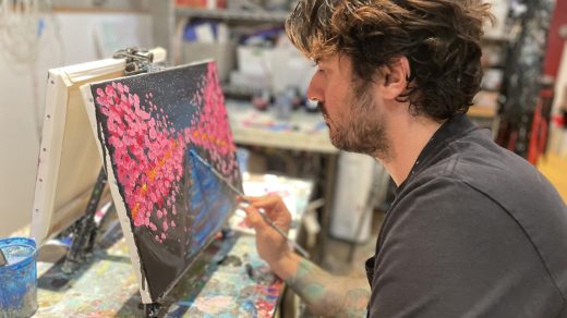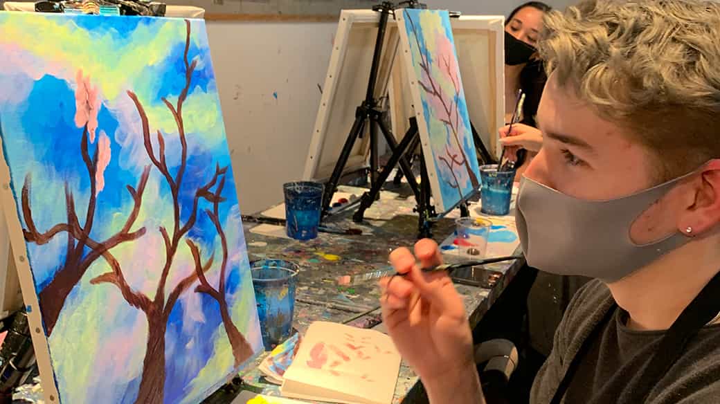 「絵画教室×ワイン」がコンセプト。ワインを片手にリラックスした雰囲気の中で、季節にあわせたテーマの絵画を描きながら、参加者同士の会話を楽しみます。少しお酒も飲みながら、一緒に絵画に挑戦しているので、自然と会話が弾みます。Art Barスタジオでご入居者とコミュニティ・マネジャーが参加しています。