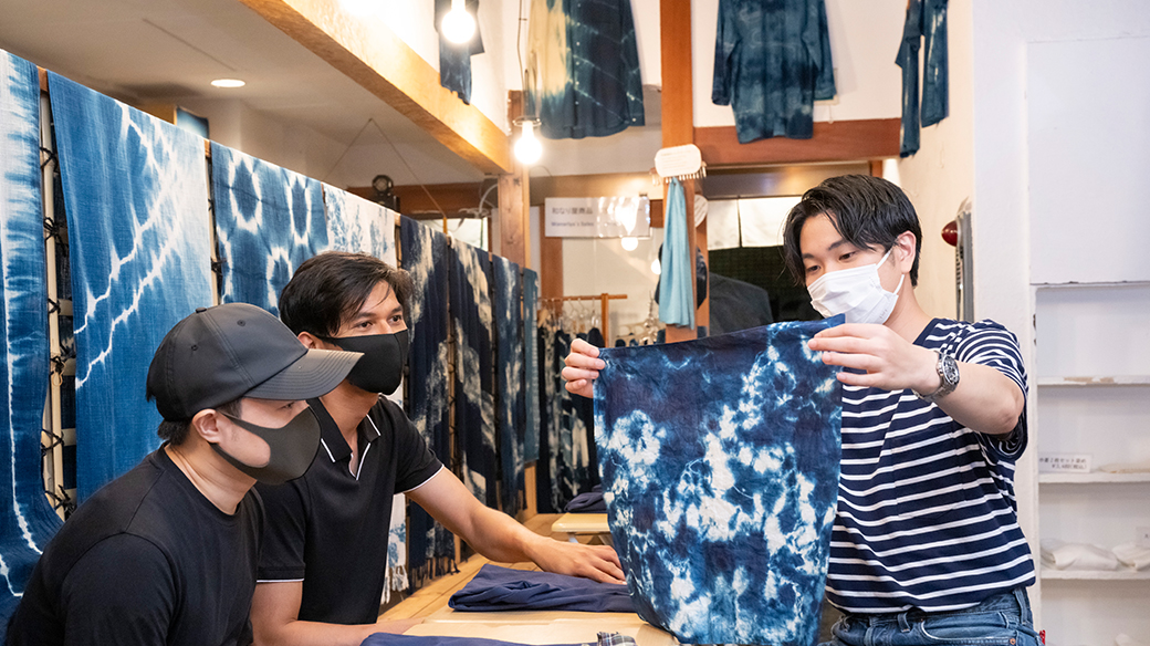 文化・伝統を体感する不定期開催のツアー。陶芸や着物の着付けなどの日本の伝統工芸から、ワインの試飲会まで、日本人も外国人も楽しめる体験ツアーを用意しております。写真は、ご入居者とコミュニティ・マネジャーの参加した江戸時代から続く染物屋さんで開催された体験型の染物イベント。