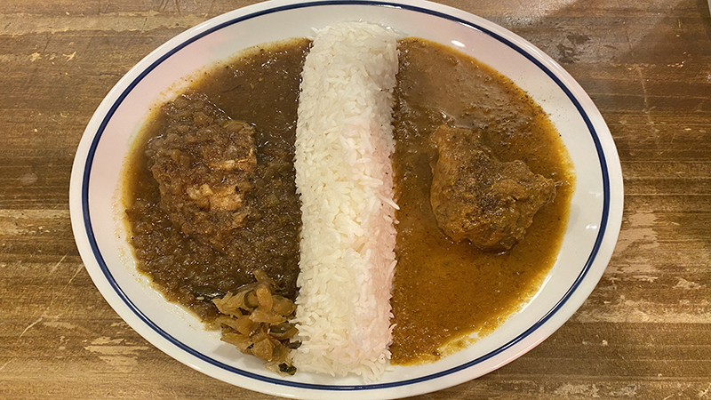 2019年、2020年と2年連続で食べログ百名店に選出されているカリーショップ。スパイスの効いた超本格カレーを食べたいならマストビジットです。自宅や他のお店では到底出会えないようなカレーに出会うことができますよ。お店の一押しは二種盛りカレーとのことで、目玉の「チキンカレー」と「ポークビンダルー」をチョイス。チキンカレー(右)は口に入れた途端、旨味と風味が広がります。ポークビンダルー(左)は日本人にとって馴染みがない名前ですが、赤ワインビネガーに漬けてあるとのことで、酸っぱさを感じる味付けです。これまで食べたことのない感じがクセになる!とリピーターさんも多いそうで中毒性のあるお味。クミン、コリアンダー、ホアジャオ(花椒)といったスパイスも卓上に用意されているので、お好みで味変も楽しんでみてくださいね。