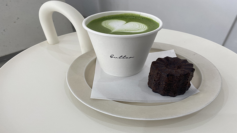 いま流行りの韓国っぽさを取り入れた、シンプルで無機質なカフェ「Butter Coffee Stand」。洗練された店内に、センスの良いBGMが響きます。店内のオーブンで焼き上げられるできたてのカヌレは外がカリカリ、中はもちもちの絶品です。お昼過ぎには売り切れてしまうこともあるとのことで、カヌレの購入は1人2個まで。テイクアウトでカヌレを持ち帰るお客さんもたくさんでした!店内は3卓のみなので、イートインは店外に行列ができることもありますが、待つ価値アリです。抹茶ラテも、茶葉の香りが引き立つ本格的なお味でカヌレとの相性抜群。インスタ映えカフェで韓国気分を楽しんでみてはいかがでしょうか。