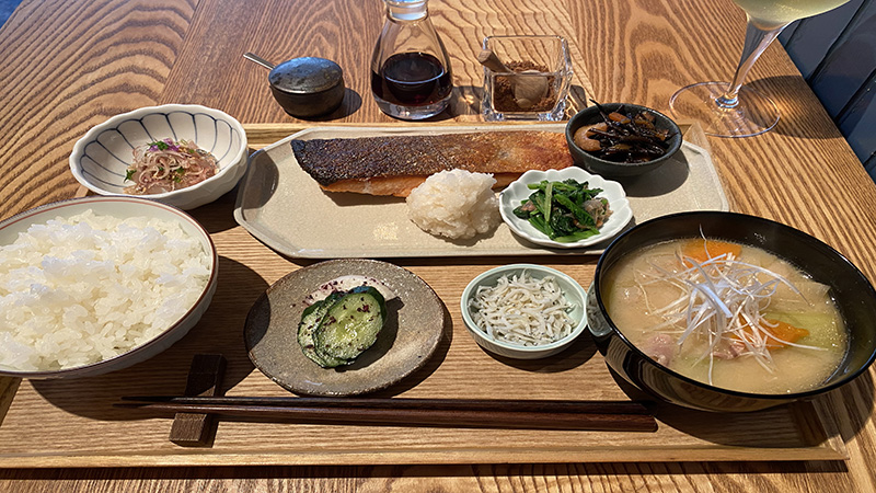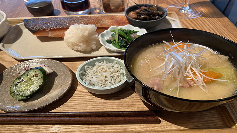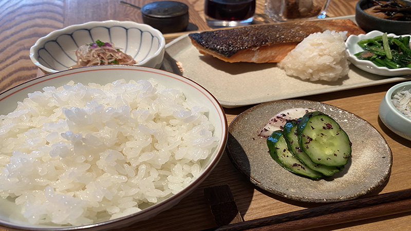 お米は「あきたこまち」を使用。極限まで減らした水分量により、一粒一粒がむっちりした食感に炊きあげられています。何杯でもおかわり自由とのことで、普段朝食をとらない派の私でもぺろりと2杯完食してしまいました。「銀鮭」は感動レベルの焼き上がり!皮がぱりぱり、身はふっくらふわふわです。添えてある鬼おろしは、鮎魚醤とホワイトバルサミコのポン酢がけという、これまた初めての味との出会い。和定食なのにどこかフレンチのスパイスを感じる、お洒落な風味です。